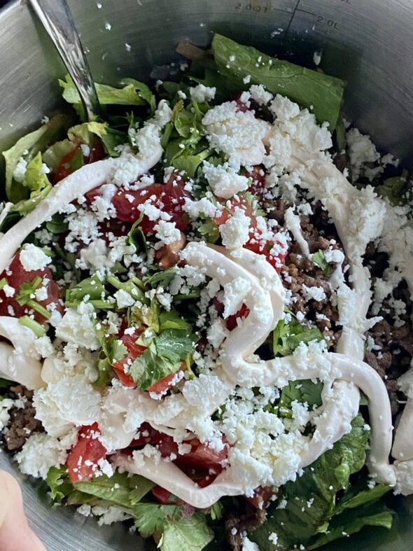 I made a taco salad, using the refreshed lettuce plus queso fresco, Mexican crema, some red peppers, and taco-seasoned ground beef.