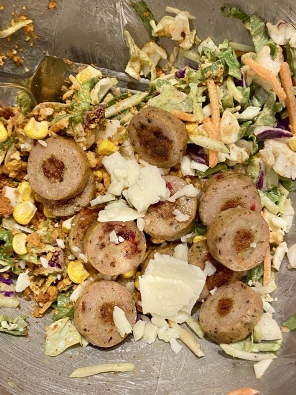 I stopped in a Trader Joe’s after my hospital shift and picked up a few things, including some chicken sausages. I browned two of those, and added them to a salad kit.