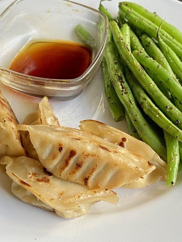 Zoe had a lot of closing shifts this week! Just me here so I heated up some frozen chicken potstickers and sauteed a big pile of green beans.