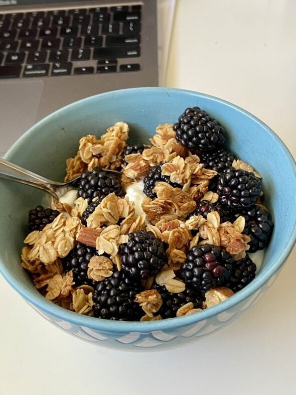 I eat a bagged salad kit from Aldi for lunch almost every day. I dump it in a big bowl and eat the whole thing by myself! For me, lunch is typically my largest meal of the day. Those salad kits are really good!