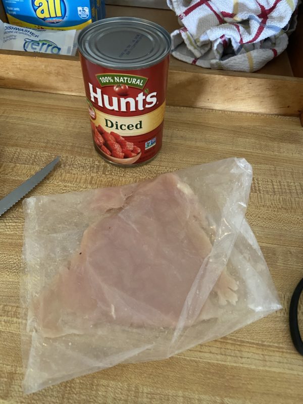 I ate the last of the Cheez-its that I’d brought, turned the bag inside out, put the chicken inside the bag, and used a can of tomatoes to pound the chicken.