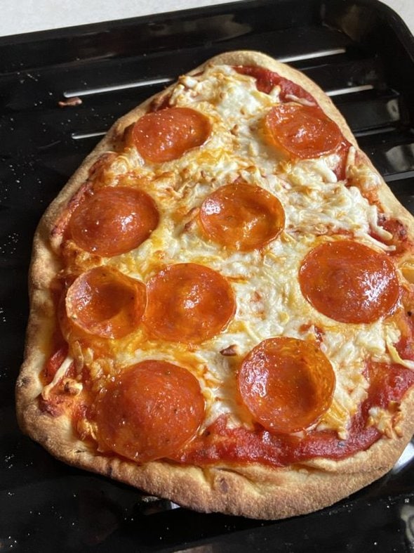We had two naan left from our tikka masala night, so I used those to make some quick pizzas in the toaster oven.