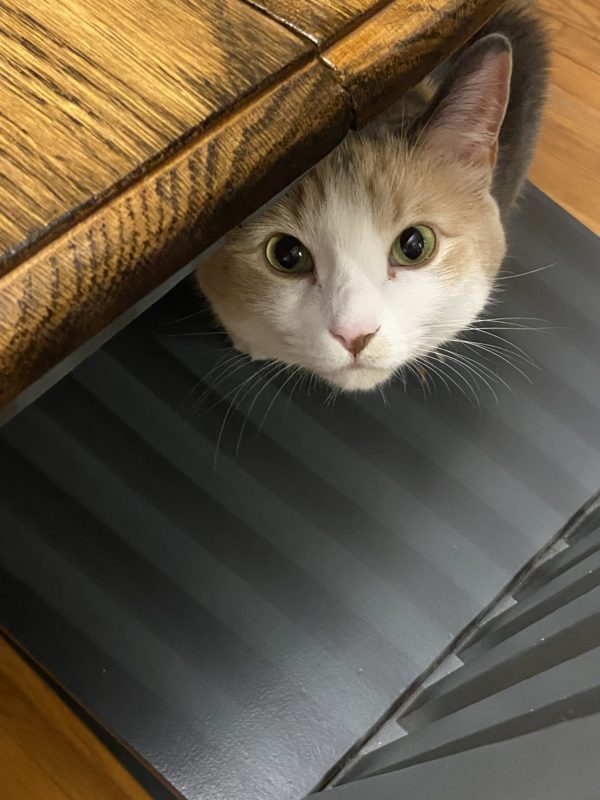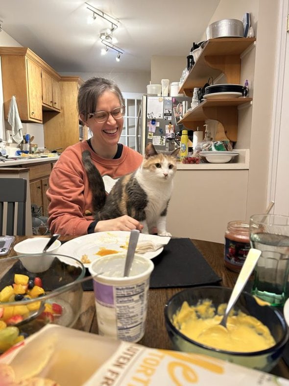I will choose to ignore Chiquita paws on the table. Saturday - steak/salmon with wild rice Pilaf with added sauteed mushrooms Sunday - usual dine out Mexican, I ate my leftovers for lunch on Monday Monday - grilled burgers with cheese and the rest of an avocado, rest of the Saturday night rice Tuesday - leftover steak from freezer fried up with potatoes, mushrooms, onions, red & green peppers Wednesday - all from local butcher shop - heat and eat brisket for sandwiches, double baked potatoes which we split in half. Kiddo and spouse arrived from out of town Thursday - turkey, gravy, stuffing, mashed potatoes, ham, deviled eggs, rolls, green beans, corn casserole, cooked apples, cranberry sauce mixed with home grown strawberries from the freezer, pumpkin cheese cake pie/whipped cream, and peanut butter cookies with chocolate sprinkles. Friday - take out sushi with kiddo