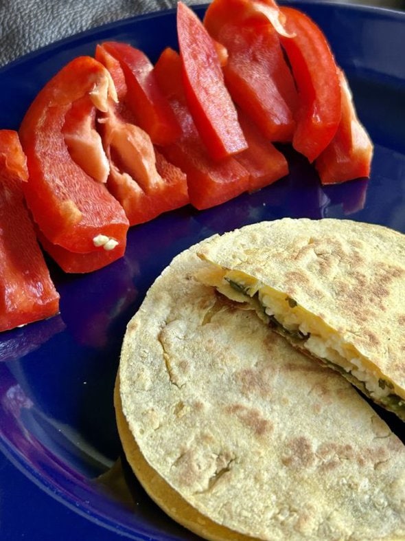 Cheese quesadilla plus sweet red peppers. Easy-peasy.