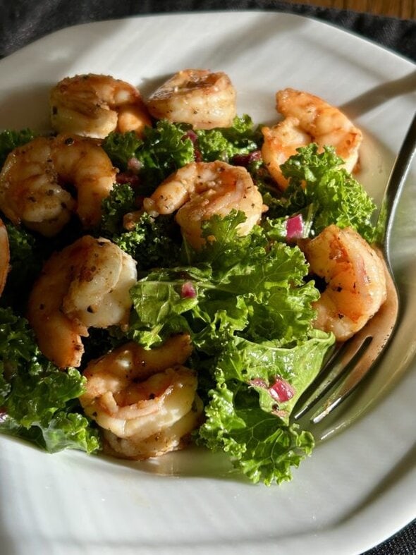 I made the kale salad I mentioned in my Five Frugal Things post, topped with seasoned and sauteed shrimp.
