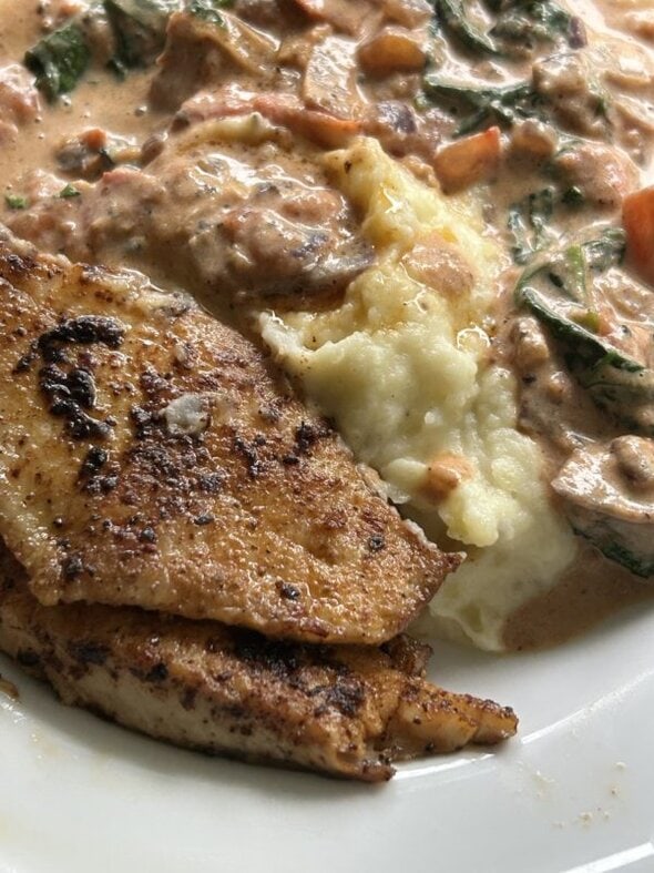 A made-without-a-recipe meal: mashed potatoes, sauteed tilapia, and a sauce with onion, tomatoes, and spinach in it.