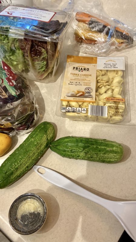 I boiled some Aldi cheese tortellini, topped them with sauce from Aldi, and made a green salad on the side, with homemade croutons.