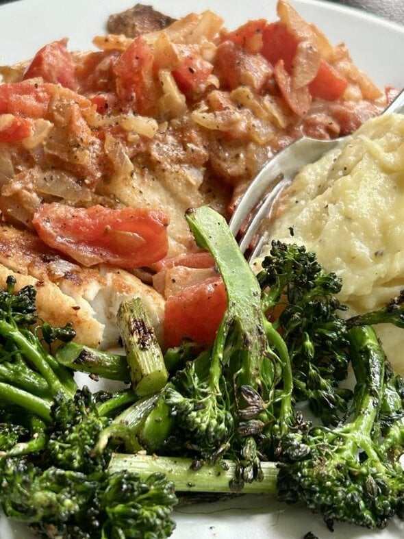 But beforehand, I had an early dinner of sauteed fish and veggies plus leftover mashed potatoes.