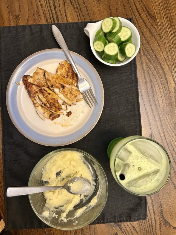 Post-work meal: the last of the mashed potatoes, some more sauteed fish, plus cucumber slices and a glass of agua de pepino. 🙂