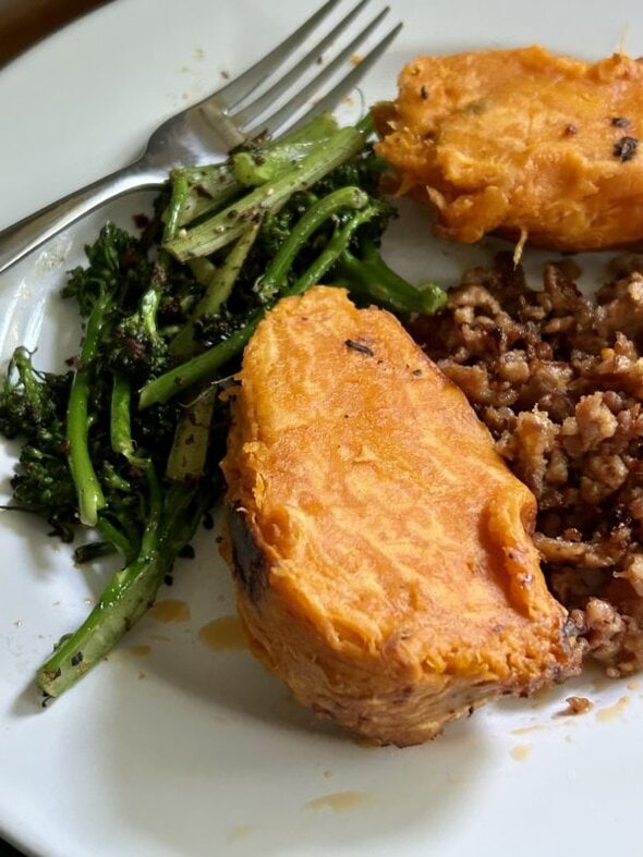 I baked some sweet potatoes, added some spicy Italian sausage and some baby broccoli, and called it a meal.