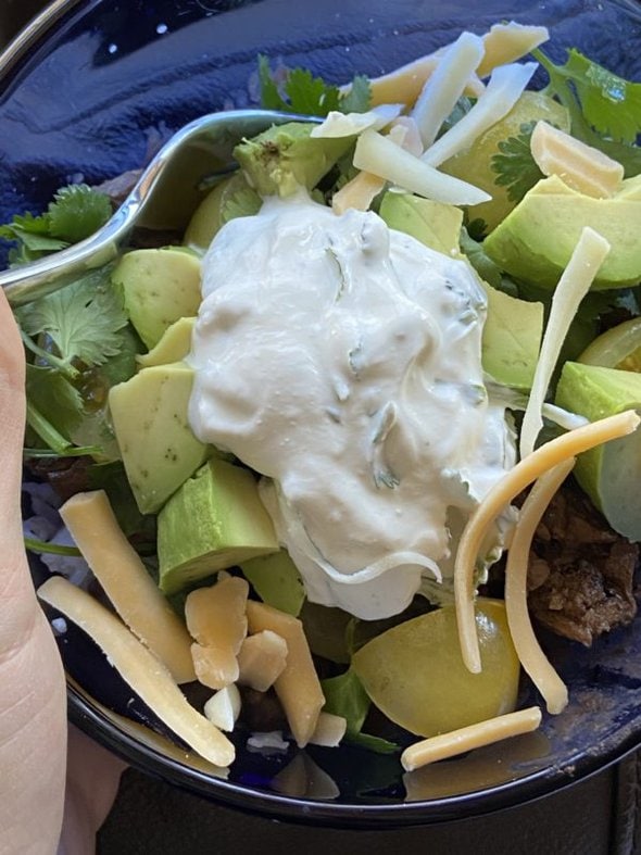 We had burrito bowls with leftover meat from the one friend, and leftover beans and rice from the enchilada meal from another friend. 🙂