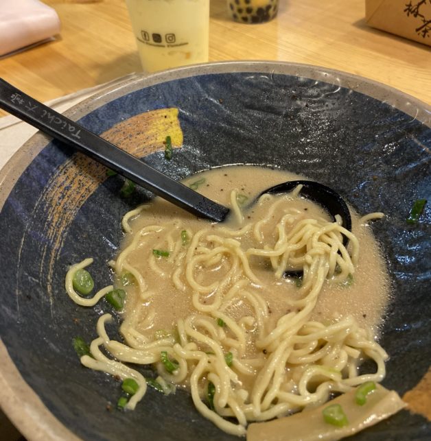 Something good happened, which I will tell you about later, and Zoe and I celebrated by going to a bubble tea place for dinner. I got a bowl of ramen (with an extra soy-marinated egg, thank you very much) and Zoe got a sushi burrito.
