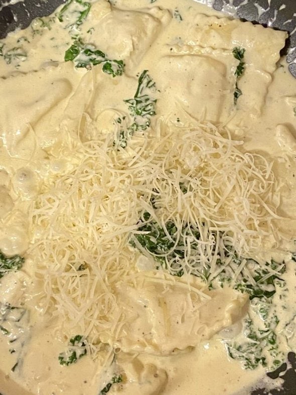 I took some leftover ravioli out of the fridge, made an eyeballed Alfredo-style sauce, added in chopped kale, and mixed it all with the ravioli.