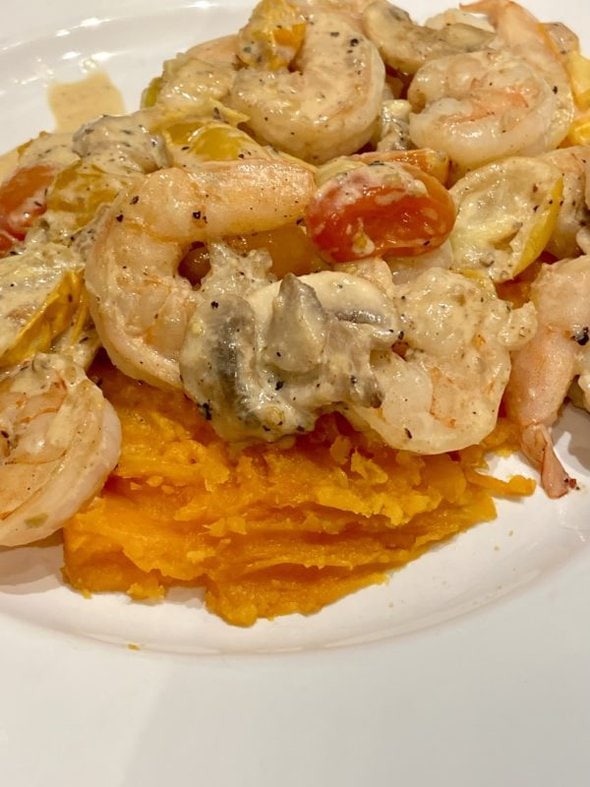 Then I sauteed some mushrooms and tomatoes (also from the Hungry Harvest box), sauteed some shrimp, added some half and half to make a sauce, and ate that on top of some of the sweet potatoes.