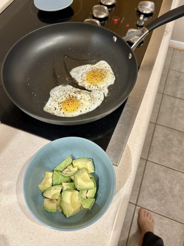 I did not feel like going to the grocery store, so I fried some eggs and ate those with an avocado (topped with salt and lime juice).