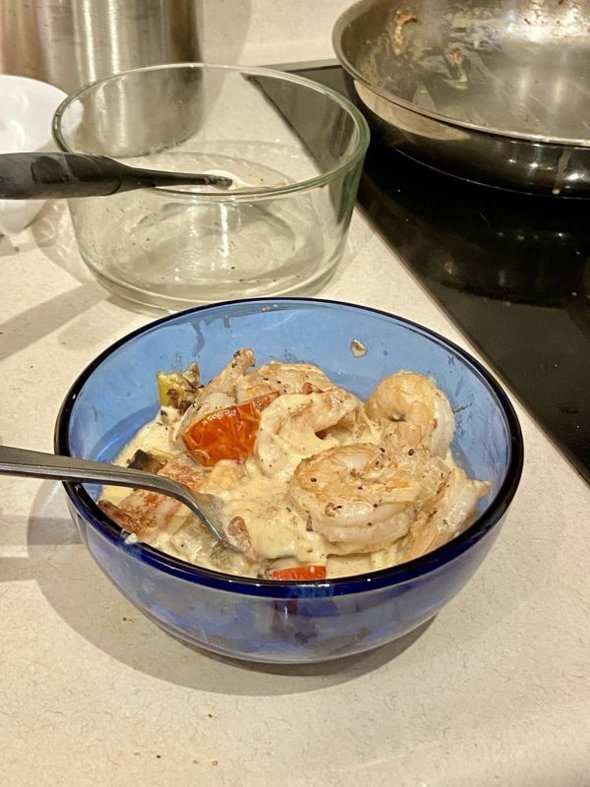 I also seasoned some chicken with a bit of leftover taco seasoning, cooked that on the stovetop, and added the rest of the roasted sweet peppers I’d made, with some half and half to deglaze the pan.