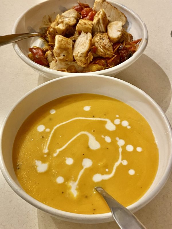 I thawed some roasted winter squash and made an eyeballed batch of soup by blending it and then adding a bit of butter, some salt, pepper, and half and half.