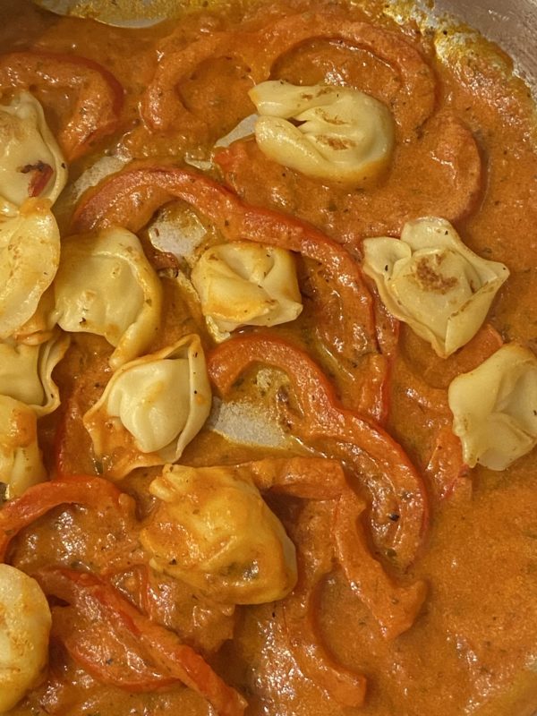 I don’t remember where Zoe was, but I made a red pepper and tomato sauce to eat with some cheese tortellini.