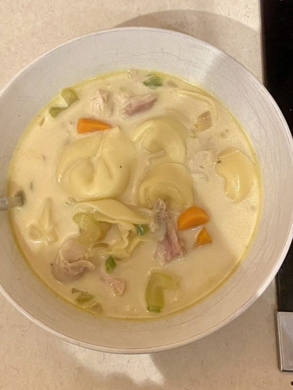 Zoe was out with a friend, and I made myself a little pot of eyeballed creamy chicken tortellini soup, to use up the last of the rotisserie chicken plus the last of the tortellini. Of course, I used my homemade chicken broth as a base since I always have that in the freezer.