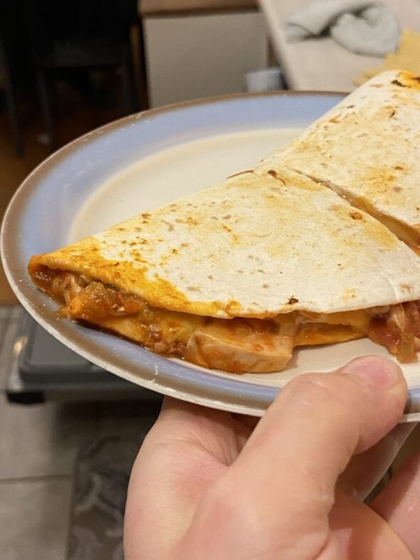 I worked a 12-hour shift at my regular job (a day shift this time), and when I got home I made myself a chicken quesadilla with the rest of the rotisserie chicken.