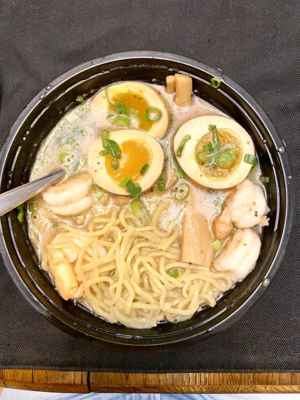 I got a bowl of shrimp ramen for myself with three soy-marinated eggs (ohhh yessss), and Zoe got a sub from Firehouse.