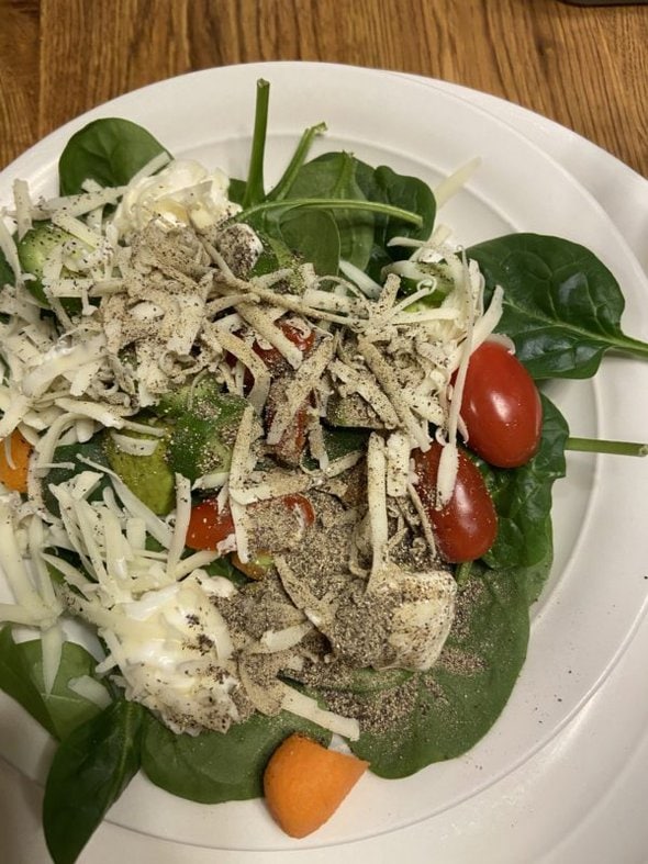 Monday: bacon ( pizza) flatbreads. Cucumber feta green olive tomato lemon juice olive oil salad. Tuesday: three bean chili over air fryer baked potatoes with cheese and sour cream Wednesday: hubby out of town. I had leftover cucumber salad with chips n salsa. Thursday: hubby out of town. I had fried egg sandwich with canned pears. Friday: travel day I ate a big breakfast from home. Packed walnuts. Lara bar. And Cliff bar. Empty water bottle.