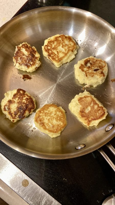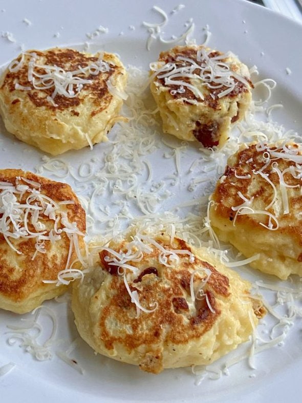 I wanted to use up the rest of the mashed potatoes, so I made some bacon and Parmesan mashed potato cakes.