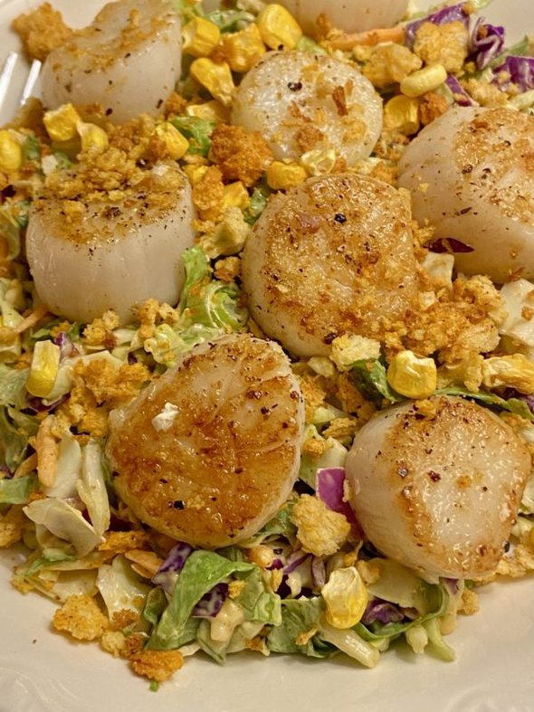 I made a green salad topped with the rest of the scallops (frozen, from Aldi, patted dry, seasoned, and pan-sauteed). I used half of one of those bagged salad kits for this.