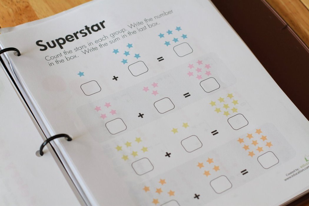 The upside to this is that you don’t have to search through the worksheets, find the ones you want, and print them each individually, so you can save a lot of time. I printed out a math book for Zoe, punched the papers, and put them in a three-ring binder.