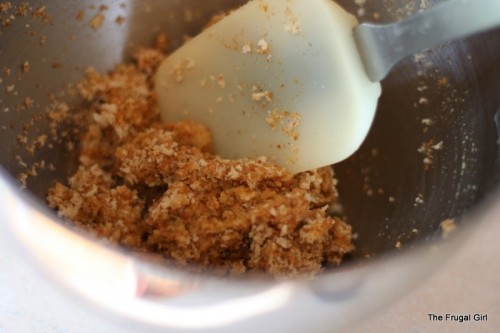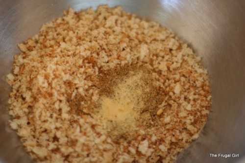 First, you mix some bread crumbs, seafood seasoning (Old Bay, to be specific!), and garlic powder. Since I never seem to have bread crumbs around, I just toast random heels and slices that I find in my freezer, cool them, and give them a whirl in my food processor. I add a little salt too, since the recipe calls for seasoned bread crumbs.