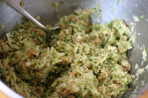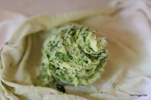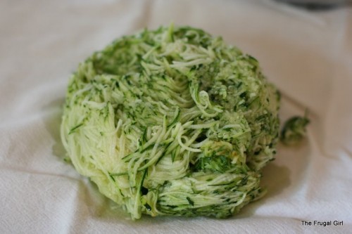 Since zucchini is so full of water, you’ll need to remove a good bit of it in order to make your patty mixture cohesive. The original recipe says to leave the zucchini to drain in a colander, but I find it to be much faster and more effective to use the dish towel method. Just put the zucchini in the middle of a non-fuzzy kitchen towel (it might leave a green stain on your towel, so use one you’re not in love with), ball it up, and squeeze as much liquid out as you can. Your zucchini should look like this when you’re done.